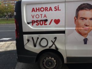 Cristina González, a través de las redes sociales ha difundido una fotografía en la que se ve la furgoneta con el lema electoral del PSOE «Ahora sí» y vota PSOE, con las siglas del partido tachadas y debajo pintado el nombre de Vox.